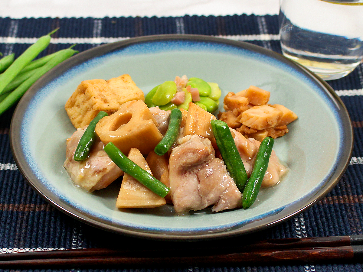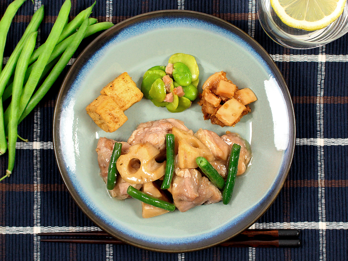 蒸しあげた鶏もも肉に、揚げたしゃきしゃきのレンコン、インゲンをトッピングして、にんにく風味の中華あんをかけました。餡と具材をよく絡めてお召し上がりください。