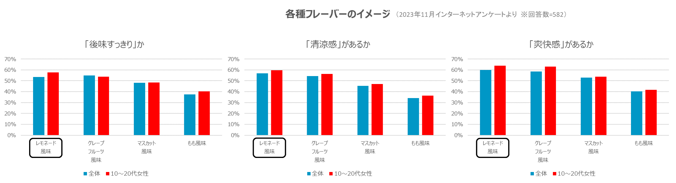 これらの分析を踏まえ、280gサイズに最適な新フレーバーを探るため更にアンケートを実施。春夏に飲みたい飲料として回答の多かった各種フレーバーの飲料の中から、「From AQUA天然水ゼリー」のポイントである「後味すっきり」「清涼感」「爽快感」のイメージが高いフレーバーは何かを質問したところ、いずれもレモネード風味の回答が多く、特に若年層女性には高い支持が得られました。