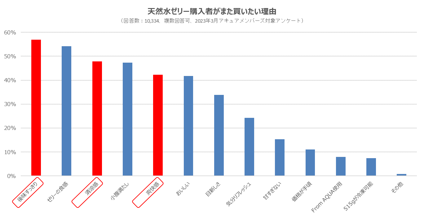 これまでのアキュアの自販機で多かった甘い系のゼリー飲料に対して、「From AQUA天然水ゼリー」は冷涼感あるラムネ風味としたことで、エキナカを中心に設置しているアキュアの自販機だけに留まらず、全国的に多くの方から好評をいただく商品となりました。そのポイントを、アンケート結果から「後味すっきり感×清涼感×爽快感」にあると考えました。