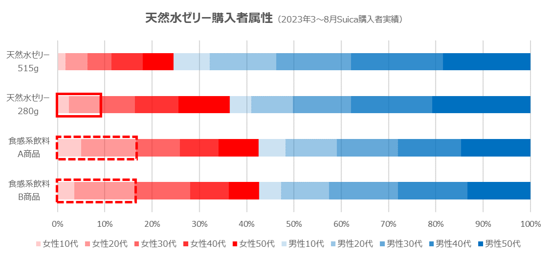 そこで小容量サイズの購入者層に着目すると、「From AQUA 天然水ゼリー 280g」は、同じく食感が味わえる商品と比べると10代・20代女性の比率が少なく、新たな天然水ゼリーのファン層拡大にあたっては、若年層の女性がポイントとなると考えました。