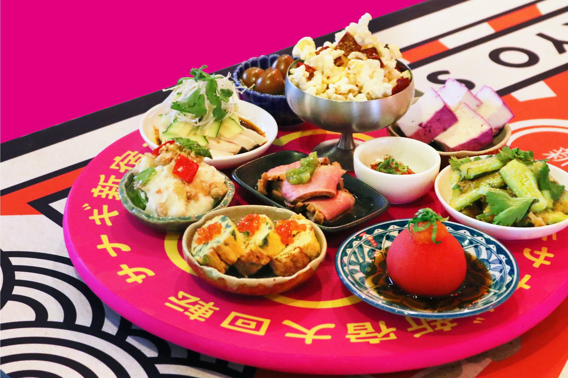 フェアの主役「盛り合わせ」は、今だけしか楽しめない個性豊かな小皿料理がオリジナルのミニ回転テーブルに乗せられて大集合!