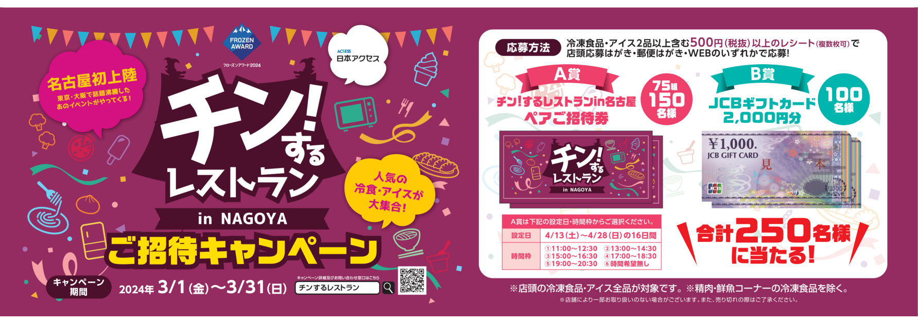今回の「チン!するレストラン」の名古屋開催に向け、本イベント開催前の3月に中部エリアの小売業様ご協力の下、消費者向けキャンペーン “チン!するレストランin名古屋ご招待キャンペーン”を実施し、本イベントに対する消費者への認知拡大と関心を高めていきます。