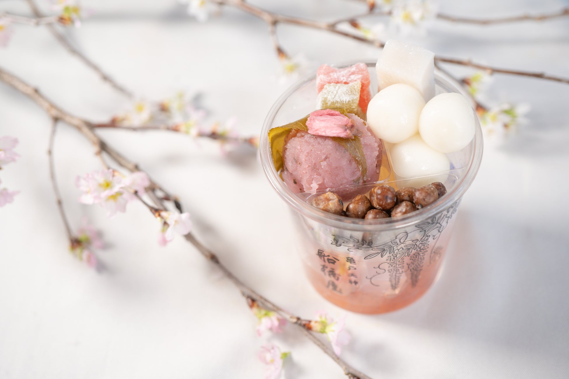 可愛いだけじゃない、上品な桜づくしの「桜白玉あんみつ」は口に入れた瞬間に桜のやさしい香りがふわっと広がります。お花見のお供にもぴったりの商品です。