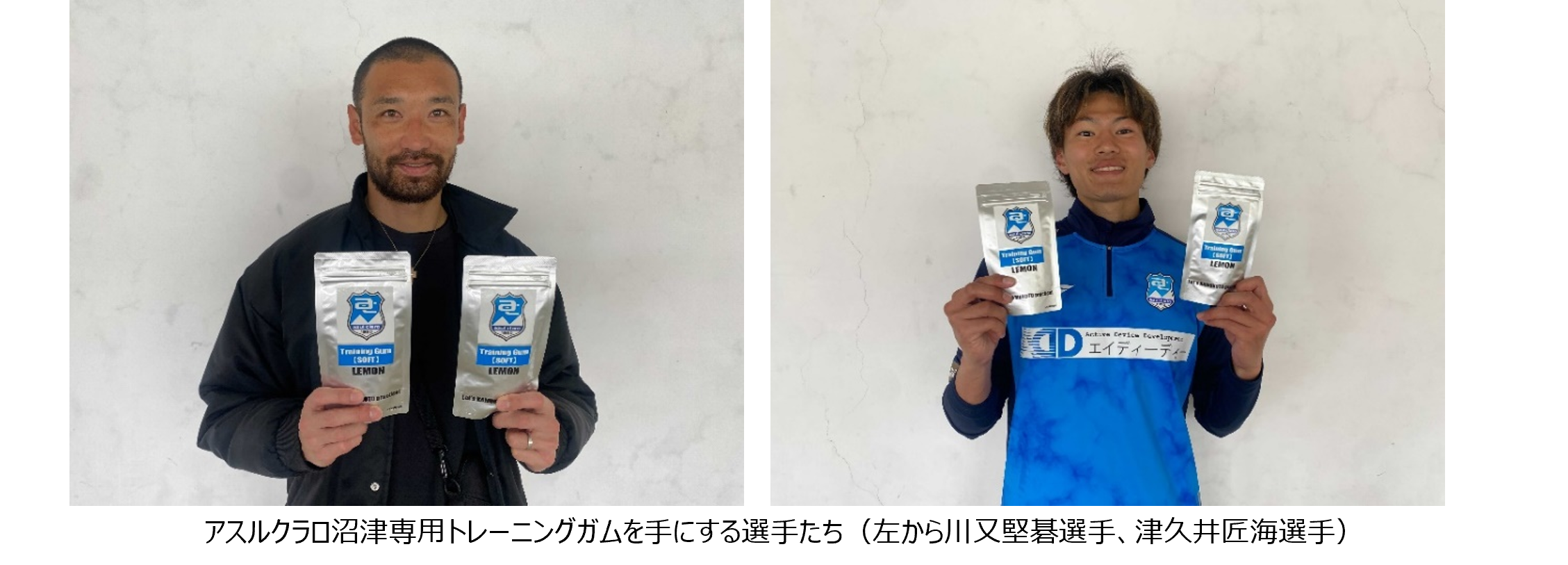 チーム専用トレーニングガムとは、一般的なガムに比べ、噛みはじめからの硬さの変化が少ない特別な設計となっています。噛んでいる間中、しっかりとした噛み応えが続くことで、噛むことのトレーニングに適しています。ソフト・ミドル・ハードの3段階の硬さのラインナップを準備しており、今回は<ソフト>の硬さのガムを提供しました。附木雄也選手は「普段、練習中、運転中にガムを噛んでいます。1日4時間以上、3粒のガムを噛んでおり、必要不可欠な存在です。トレーニングガムは硬さが持続するため水分を口にしても緩まないところが良いです。また、過去にマウスピースをつけてプレーをしていたこともありますが、ガムを噛んでいる方が集中できる感覚があります。チームのJ2昇格を目標として、トレーニングガムをキーアイテムに一緒に戦っていきたいです」と意気込みをいただきました。