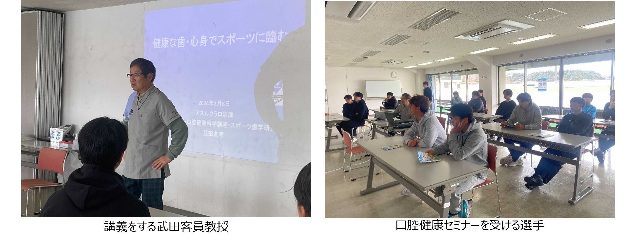武田客員教授による口腔健康セミナーでは、「特にサッカーにおいては、キックの際等に噛みしめることにより咀嚼筋が活動し、瞬間的なパワーを効率的、効果的に発揮することにつながります。ヘディング時は、強く噛むことにより首が固定されやすく頭部のゆれが減少するため防御力も高まります。また、噛むことにより唾液の働きが活発になるため、口の健康を守るだけでなく、唾液中の免疫物質や成長ホルモン等により体の健康への影響も期待できます」といったお話がありました。津久井匠海選手は「ガム咀嚼トレーニングでスタートダッシュが速くなった研究データが1番印象的で、噛むことの重要性を身に染みて感じました。噛むことのトレーニングとしてガムを活用したいと思いますし、ガムを噛むだけでパフォーマンスアップにつながるのは手軽で良いです。セミナーに参加して噛むことの意識が高まりました。日々のトレーニングでも活かしていきたいです」といった感想をいただきました。