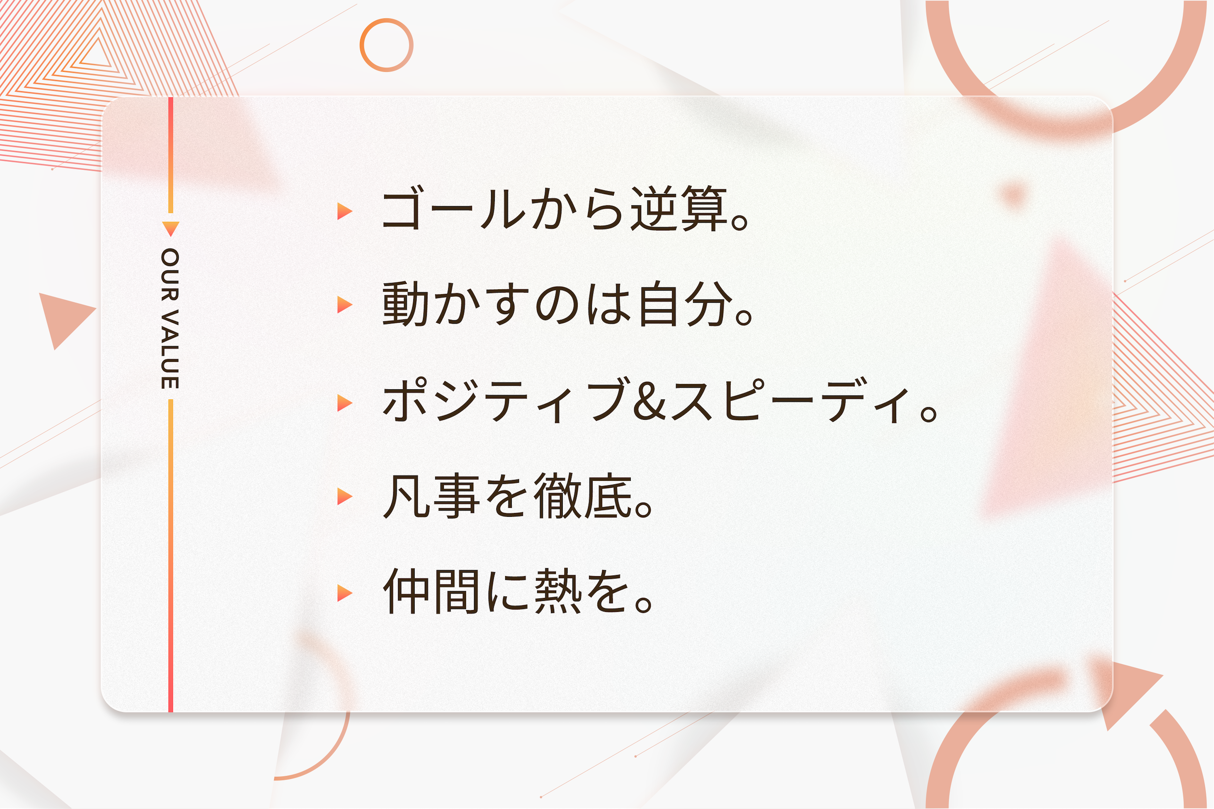 大きなミッションを掲げている当社に関わる仲間が、どのような想いや考えを持ち行動してほしいか、どのような仲間と一緒に働きたいかという観点で新たに策定しました。設立当初から事業環境、組織の状況などが大きく変わっているからこそ、原点に立ち帰り、仲間に伝わりやすいよう、シンプルにしました。