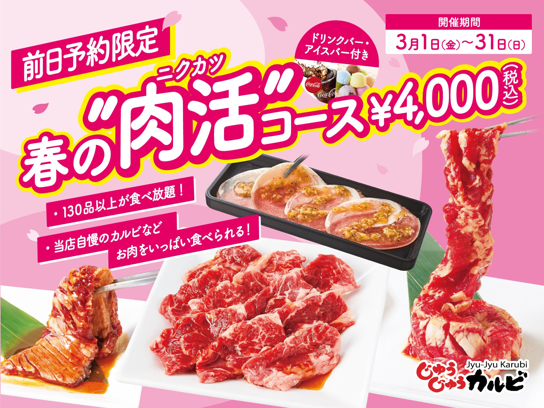 4,000円ポッキリでじゅうじゅうカルビ人気の焼肉食べ放題コース、ドリンクバーとアイスバーをお楽しみいただけます。送別会や宴会、ご友人やご家族の集まりなどにぜひご利用ください。