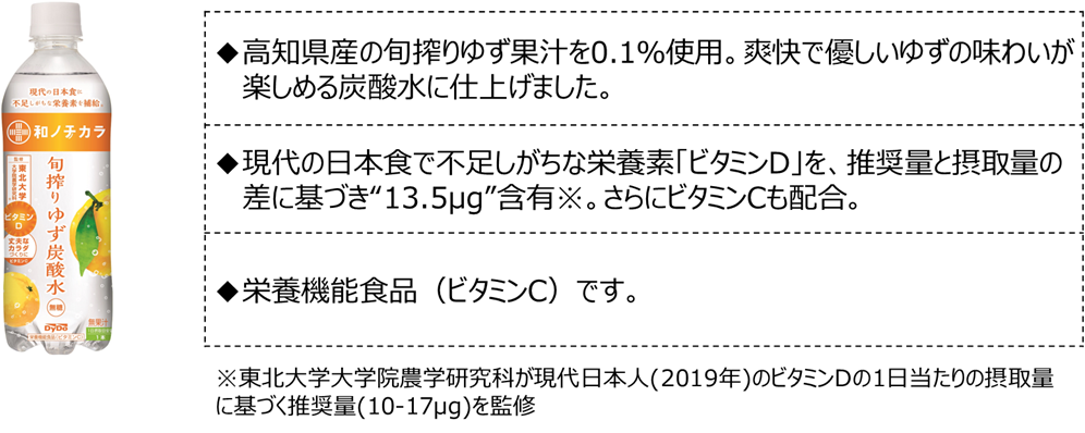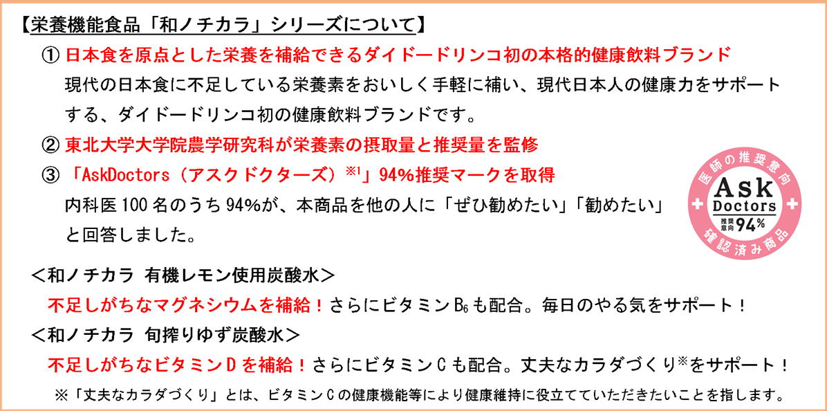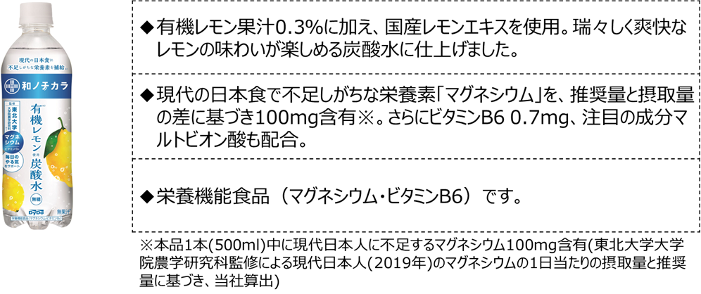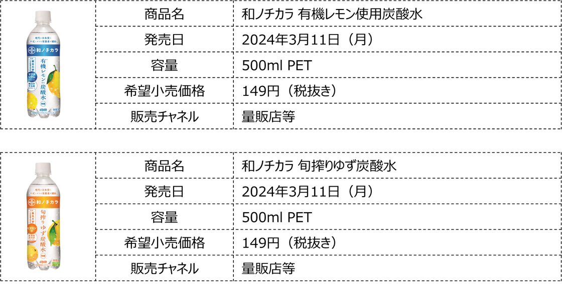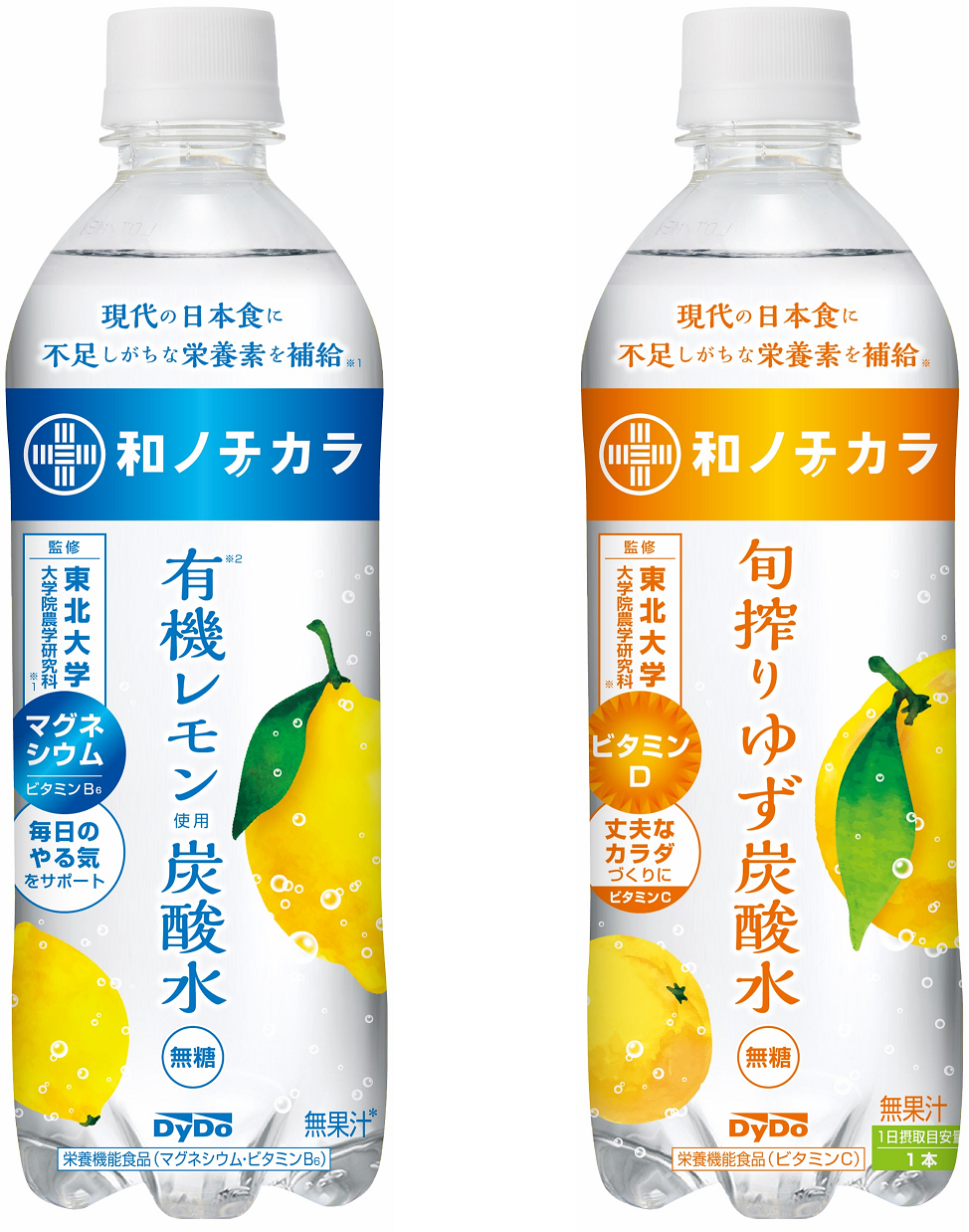 この度、幅広く飲用されている無糖炭酸水をベースに、不足しがちなマグネシウムを補給できる「和ノチカラ 有機レモン使用炭酸水」と、ビタミンDを補給できる「和ノチカラ 旬搾りゆず炭酸水」をリニューアルして発売いたします。