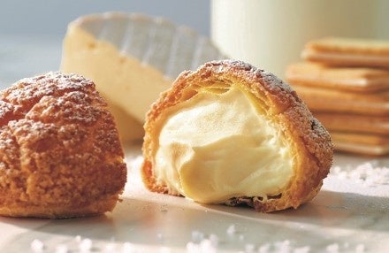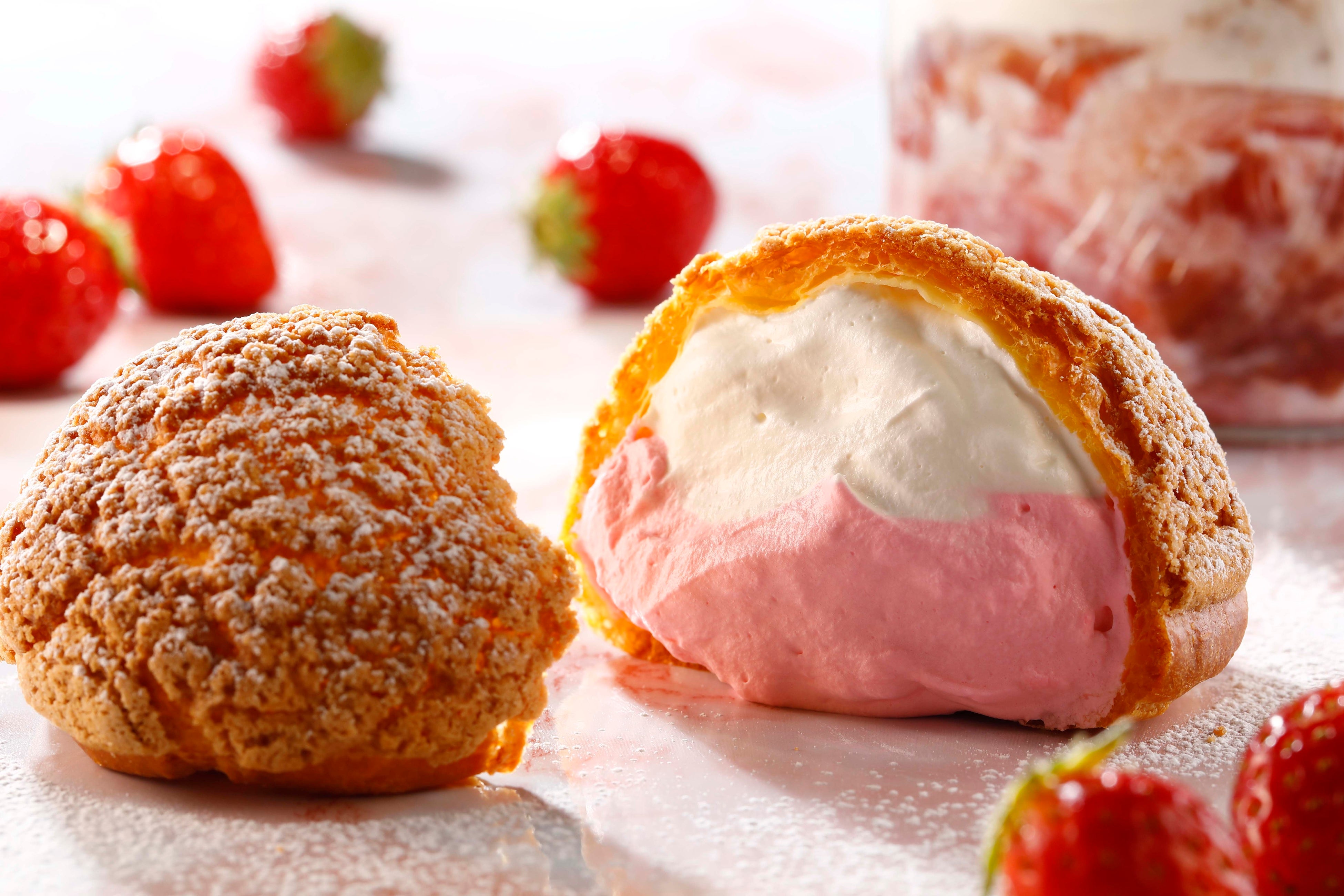 カマンベールチーズクッキーをのせて焼き上げたシュー⽣地に、北海道でつくられた生クリームとマスカルポーネチーズで仕上げた“チーズクリーム”と苺ペースト入りの“苺クリーム”の2つのクリームを詰め込みました。
