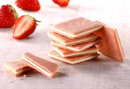 春らしい華やかなピンク色のフルーティーなストロベリークッキーでミルク感のあるやさしい甘さのマスカルポーネチーズ風味のチョコレトをサンドした、サクサク食感のクッキーです。