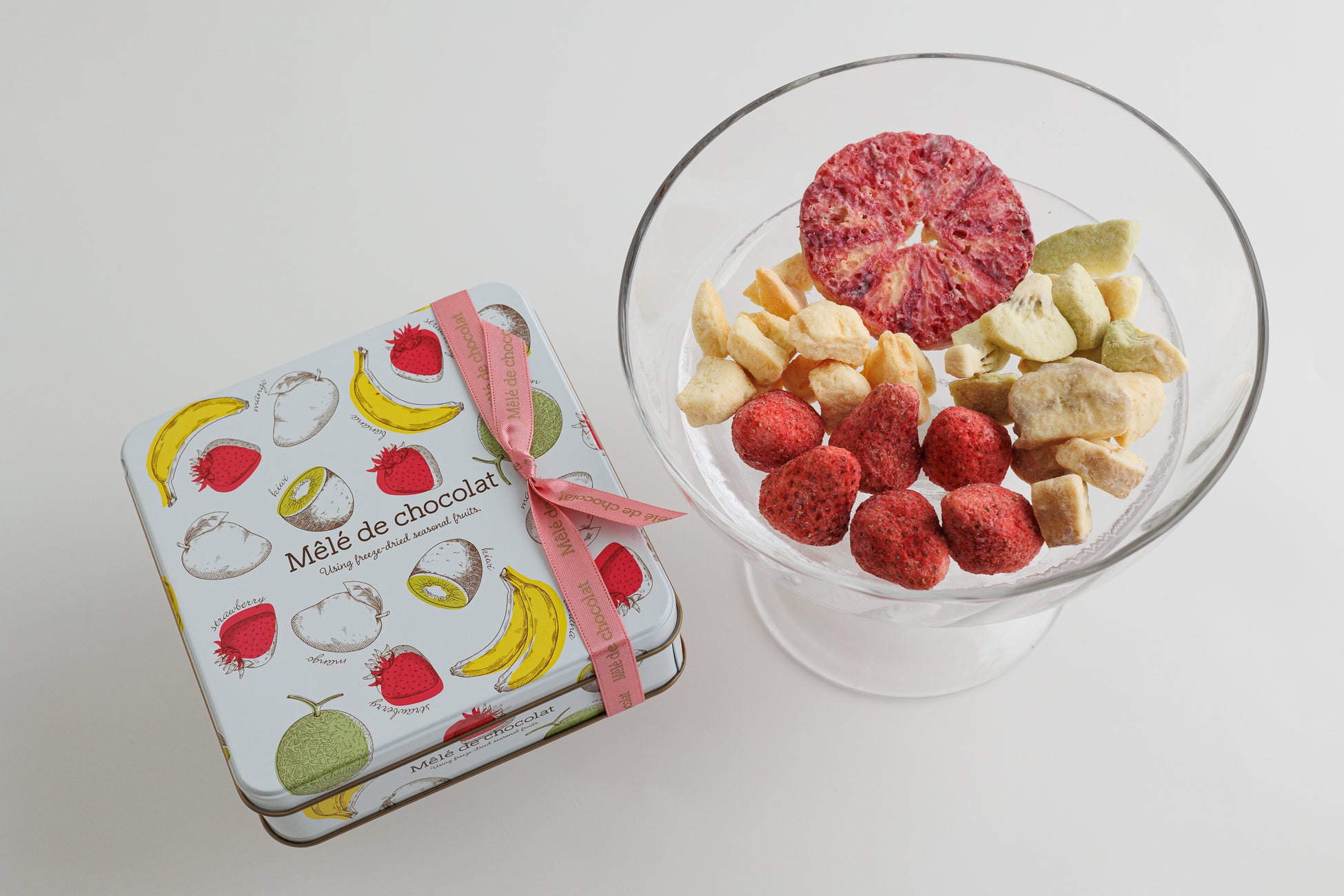 NEW〈メレ・ド・ショコラ〉フリーズドライのフルーツに含浸製法でじっくりチョコレートを浸みこませた新触感のフルーツチョコレート。果実なのにホロッ、チョコなのにサクッ!軽い口当たりの爽やかな果実感が、やがてチョコレートの滑らかで濃厚な舌触りへと変化。ブラッドオレンジが入った5種の限定アソートは、可愛いフルーツのイラスト缶で女性に好評です。