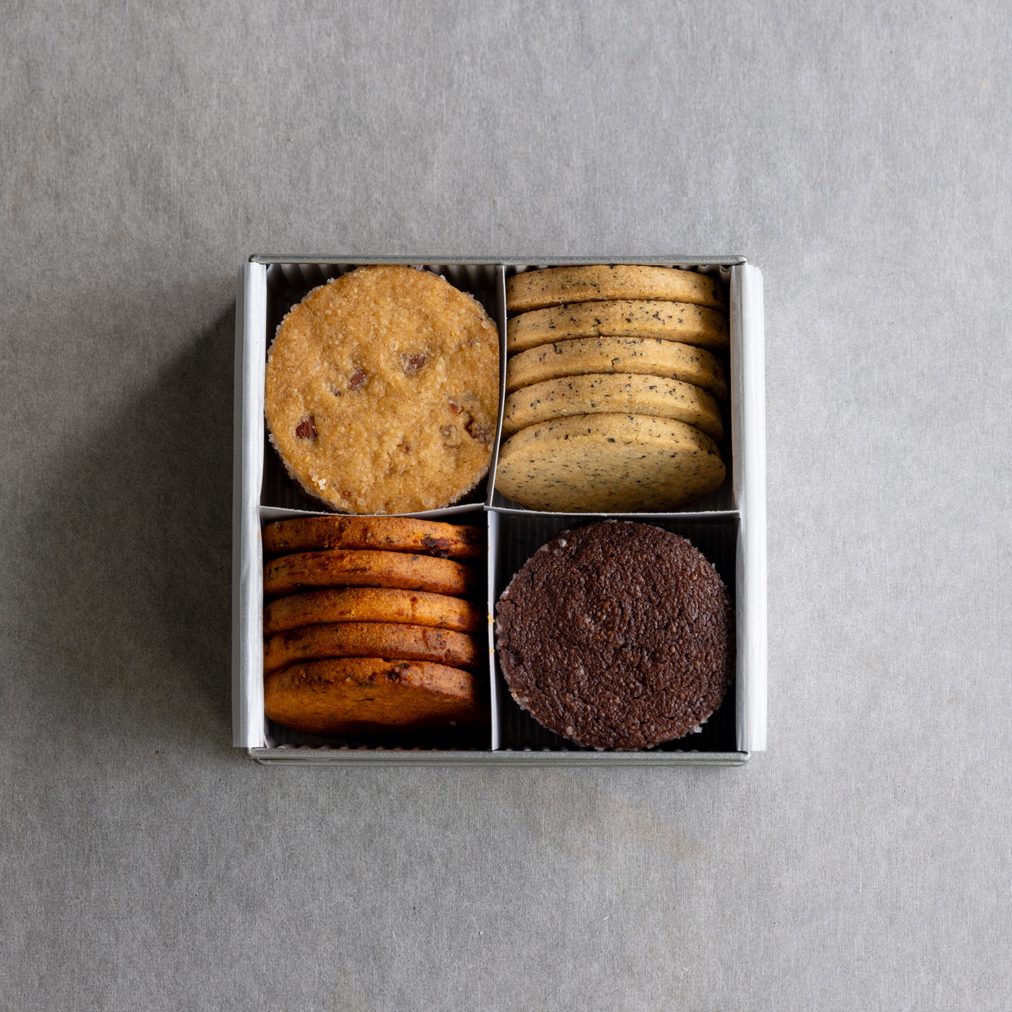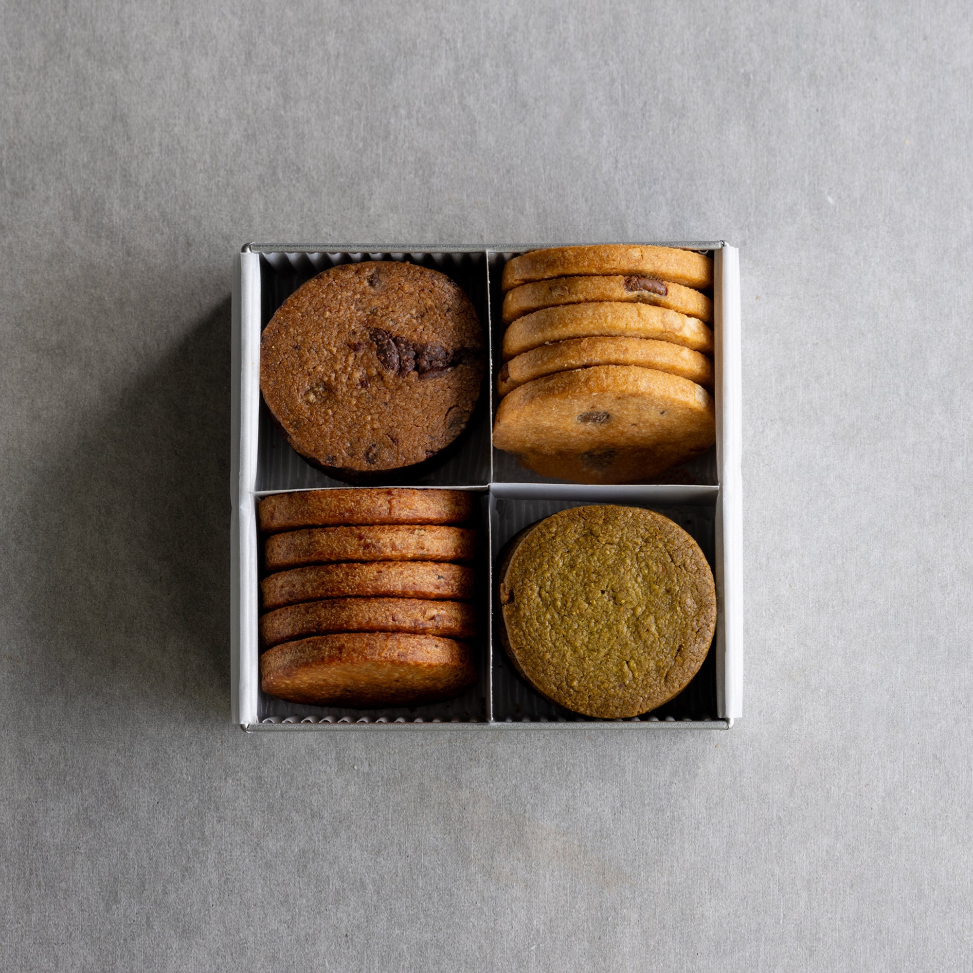 ピスタチオ、オニオン、マカダミア、カフェ、4種類のサブレが入ったクッキー缶