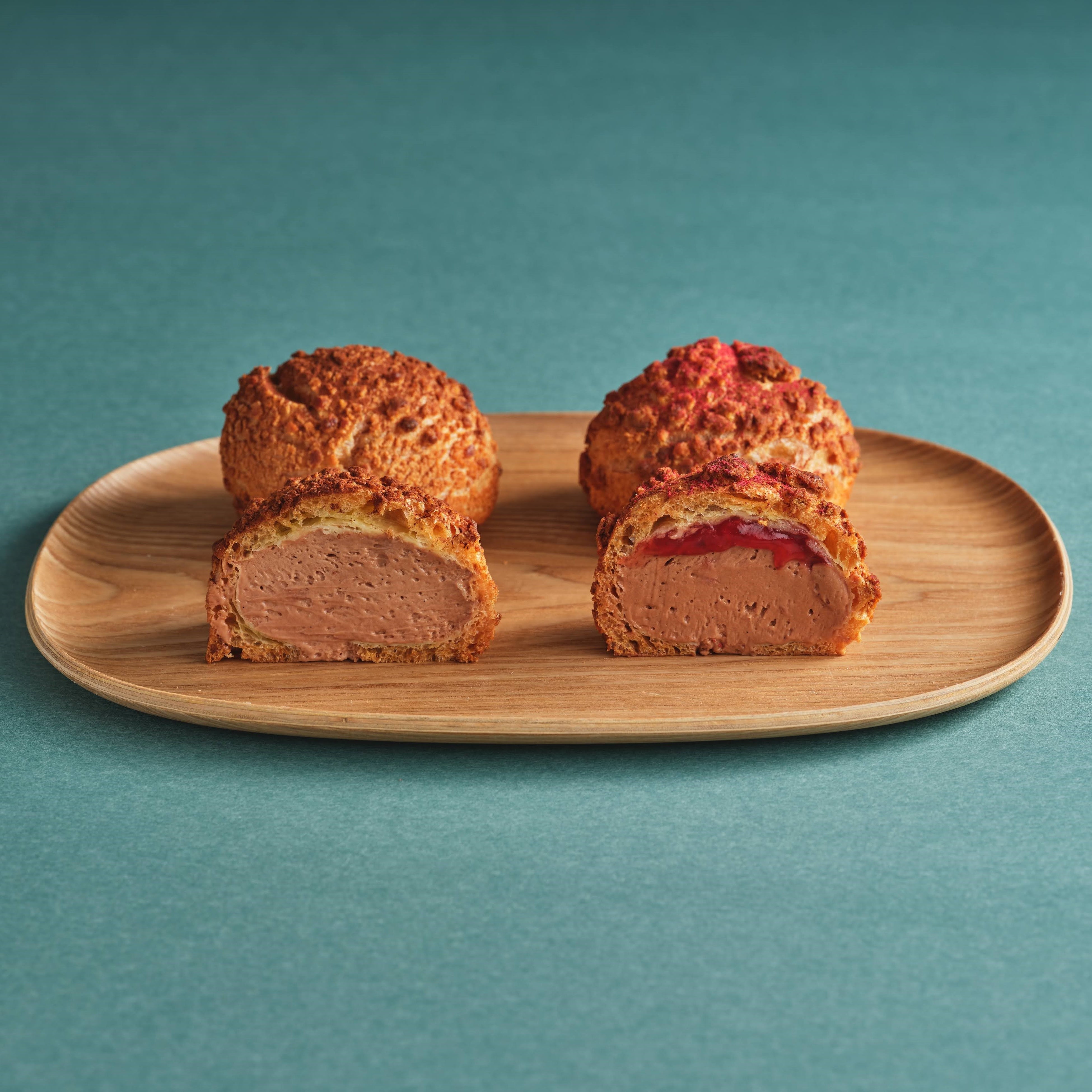苺ショコラカスタードクリームをたっぷりと詰めた2種類のシュークリーム。
