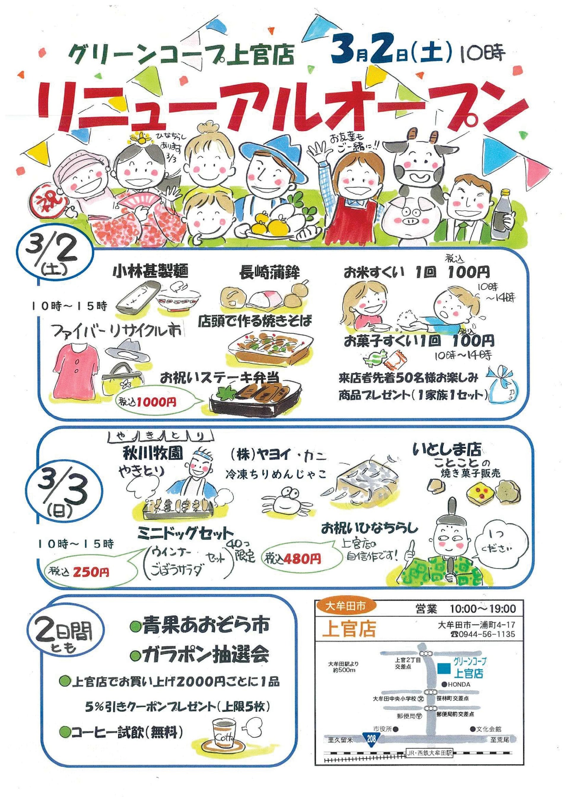 グリーンコープの組合員はもちろんのこと、組合員ではない方々にも来店いただき、安心・安全、そして環境にこだわったグリーンコープの商品とリニューアルで新しくなったグリーンコープ上官店を知って欲しいと願っています。