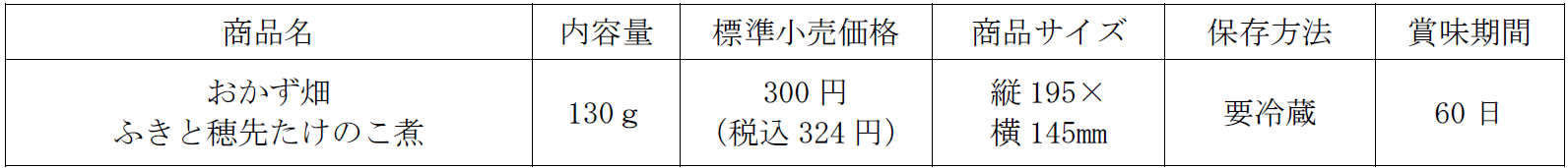 今回、新たに発売する「おかず畑 ふきと穂先たけのこ煮」は、下処理に時間がかかるふきを使用した商品です。忙しい生活の中でも、気軽に栄養バランスのとれたていねいな食事をしていただきたいという思いから、手間がかかるふき、たけのこを使用した包装惣菜を開発いたしました。手間いらずでサッと出せる副菜として、日々の食卓を彩ります。