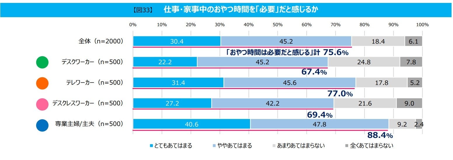 「おやつ時間を必要だと感じるか」という質問では、全体では75.6%と多くの人が「必要」と感じているという結果に。働き方別では「専業主婦/主夫」(88.4%)、「テレワーカー」(77.0%)、「デスクレスワーカー」(69.4%)、「デスクワーカー」(67.4%)の順に多くなりました。