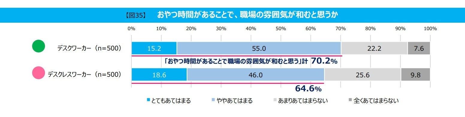 また、会社や職場へ出勤する「デスクワーカー」と「デスクレスワーカー」に聞いた「おやつ時間があることで、職場の雰囲気が和むと思うか」については、「デスクワーカー」は70.2%が、「デスクレスワーカー」は64.6%が「和むと思う」と回答しており、コミュニケーションの機会としても「おやつ時間」を望む声は多いようです。