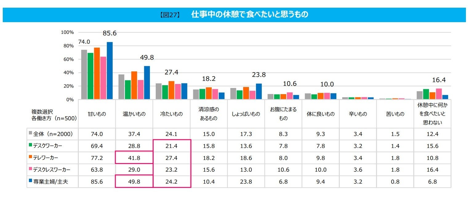 「仕事や家事中の休憩で食べたいもの」を聞くと、1~3位は全グループで共通の項目が並びました。1位は、2位以下に大きな差をつけ「甘いもの」で、全体(74.0%)では7割以上という結果に。2位は全グループで「温かいもの」となり、特に「専業主婦/主夫」や「テレワーカー」は他のグループより多く、キッチンの有無も影響していそうです。3位は対照的に「冷たいもの」で、こちらは「テレワーカー」の27.4%を筆頭に、全グループで2~3割が回答しました。 加えて、「清涼感のあるもの」を食べたい人も一定数いることから、ひんやりしたものを求める傾向もありそうです。「しょっぱいもの」 は、「テレワーカー」(18.6%)と「専業主婦/主夫」(23.8%)と、在宅が多いと考えられるグループで選ばれています。