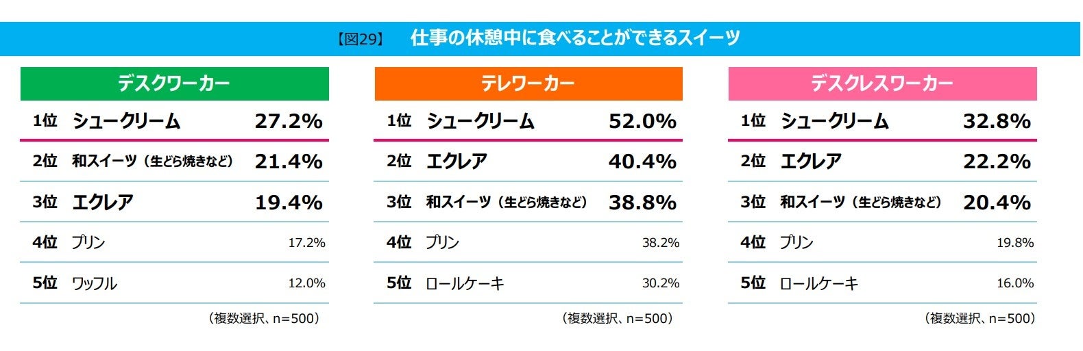 「休憩中に食べることができるスイーツ」について、仕事中の休憩で何かしらの制約があると思われる「デスクワーカー」「テレワーカー」「デスクレスワーカー」に聞きました。「デスクワーカー」は「シュークリーム」(27.2%)、「和スイーツ」(21.4%)、「エクレア」(19.4%)、「テレワーカー」は「シュークリーム」(52.0%)、「エクレア」(40.4%)、「和スイーツ」(38.8%)、「デスクレスワーカー」は「シュークリーム」(32.8%)、「エクレア」(22.2%)、「和スイーツ」(20.4%)の順に多く、トップ3には同項目が並び、片手で食べやすいスイーツがランクインしています。