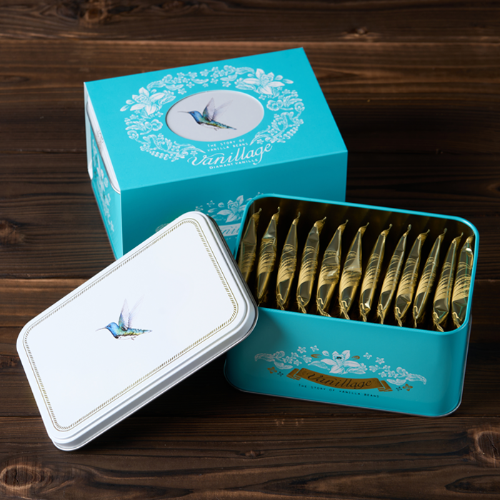 山火事で動物たちが次々と逃げる中、小さなハチドリは口ばしに水を含み、一滴一滴火の中に水を落としていったというお話です。バニラージュのロゴマークには、小さな一滴のように、お菓子ひとつひとつが世界の誰かのためになるようにとの想いをこめています。