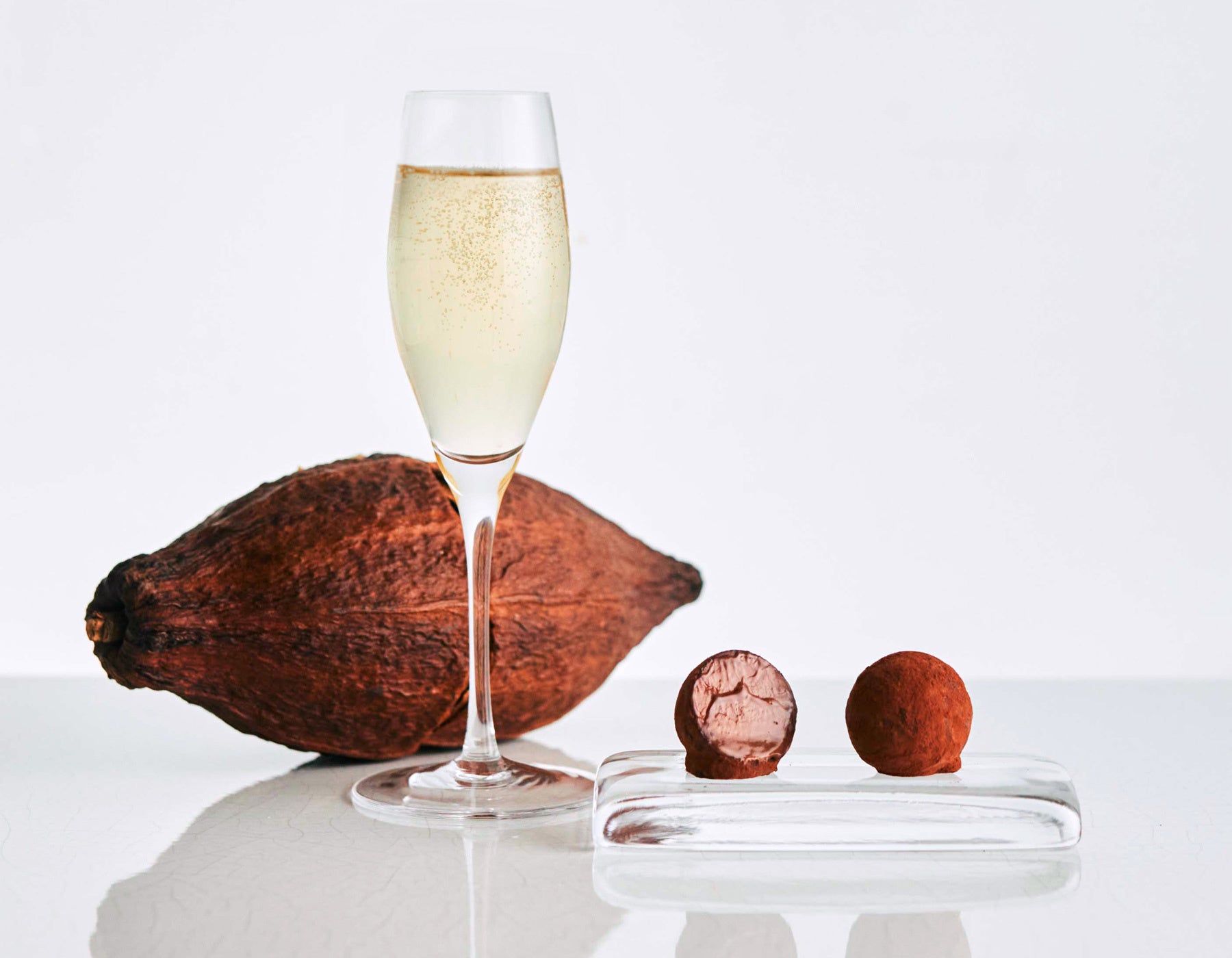レストラン「ROBB」のコース料理のデザートとして生まれた一品。外側のチョコレートは少し力を入れただけで割れそうなほど繊細ながら、 口の中でパリッと弾けた瞬間に、中から液状のチョコレートが溢れ出す、メゾンカカオの人気作です。限定の味わいは、柔らかなアタックの後、柑橘の香り、甘みと酸味 、ミネラルのバランスが良いシャンパンとビターチョコレートを合わせました。