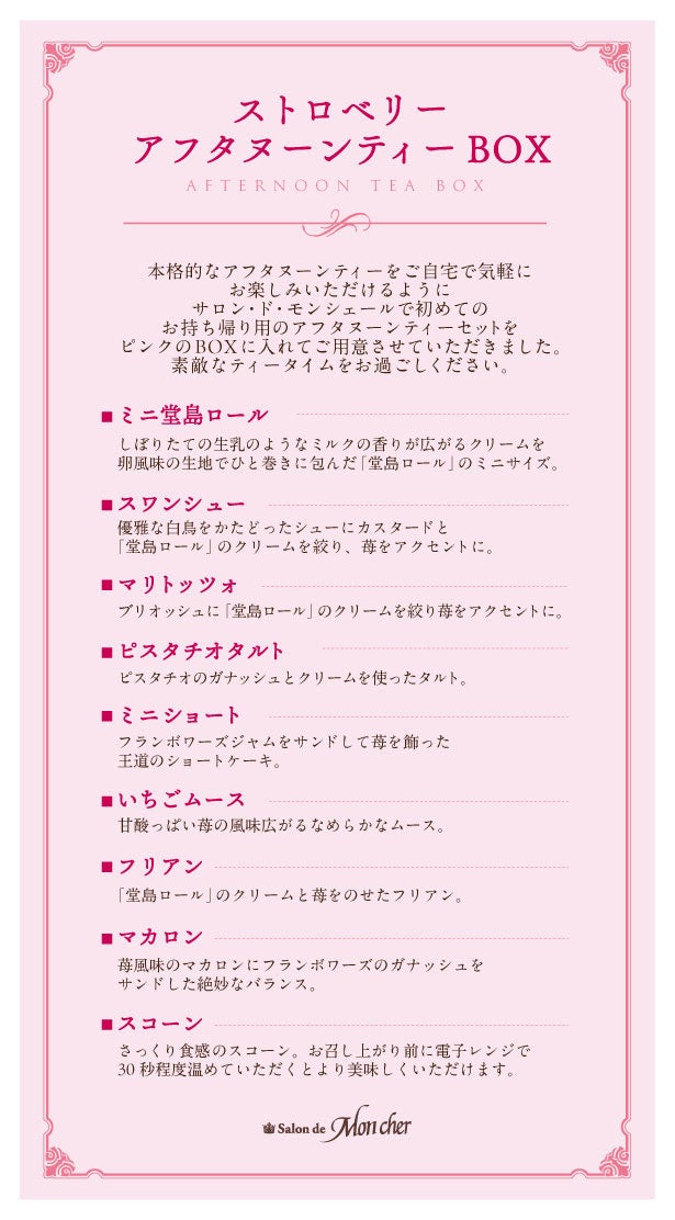 通常のアフタヌーンティーセットのスイーツから9種類をセレクトして、ピンクのお箱に詰め合わせた、お手土産にも・ご自宅利用にも便利使い間違いなしのBoxです。