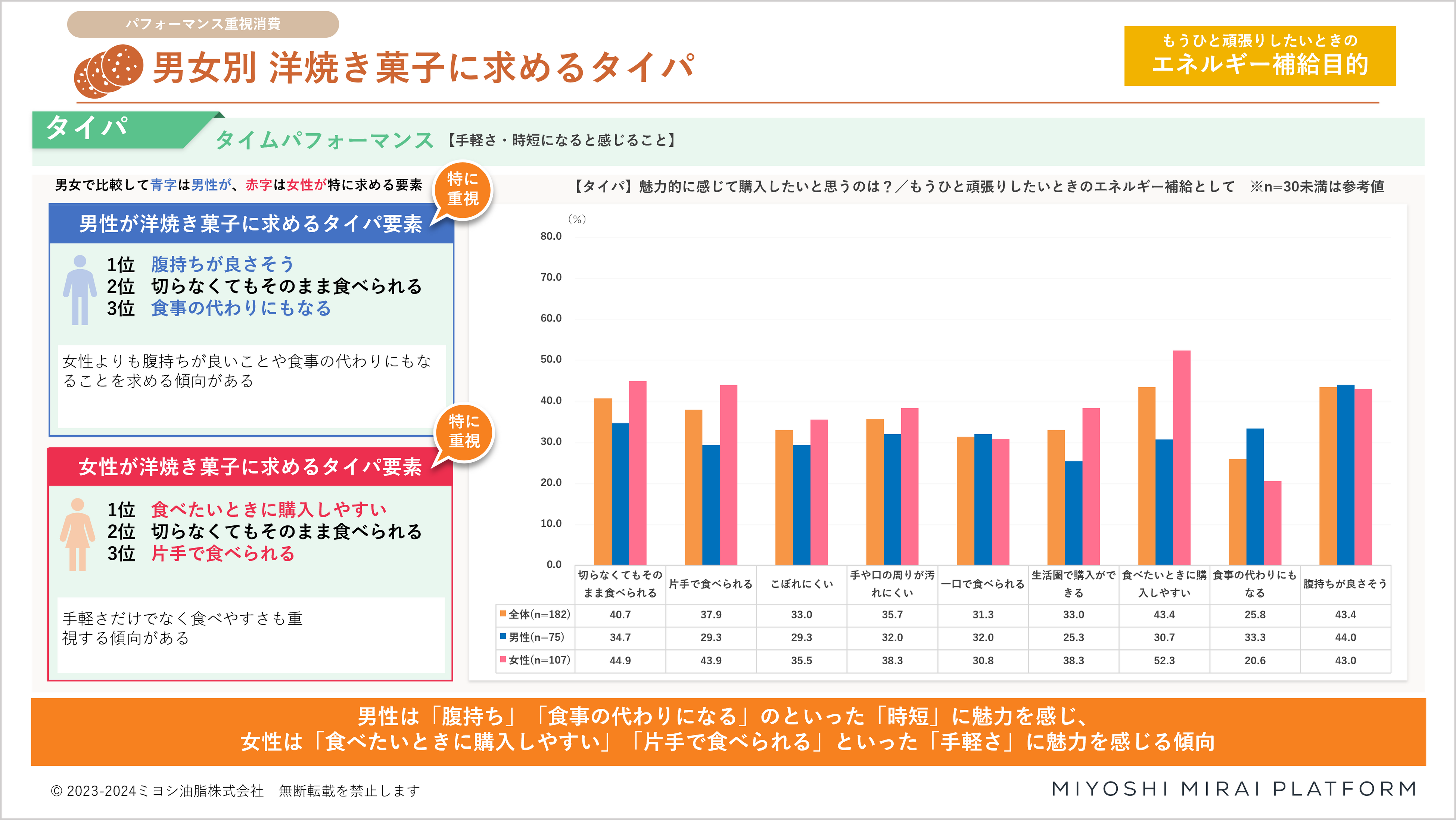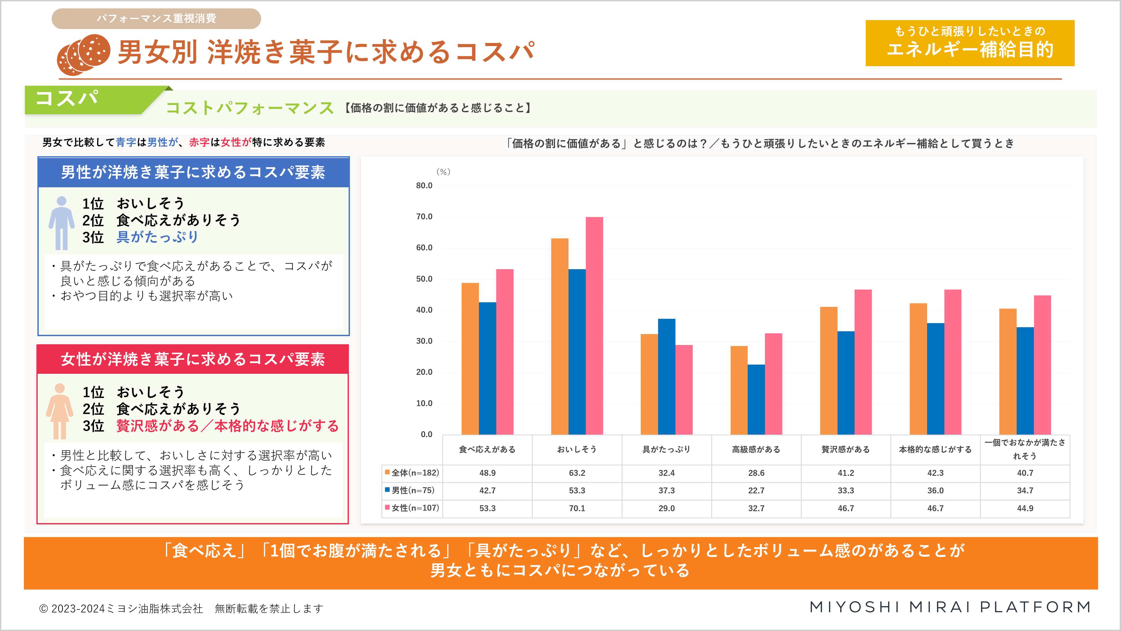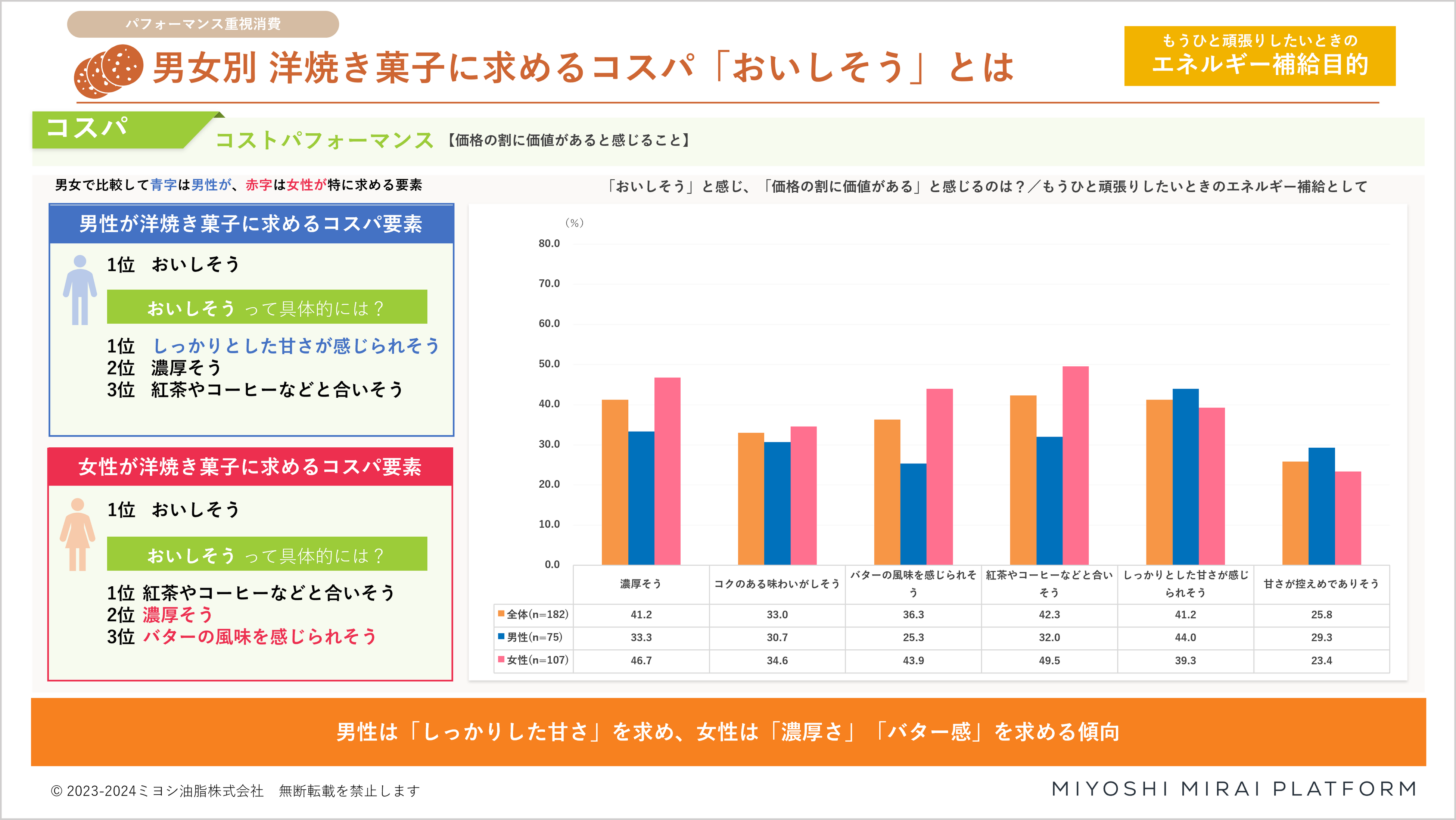本調査では、「食事以外のおやつ・デザート・間食目的」での洋焼き菓子購入時に求めるパフォーマンスについても聴取し、男性は「食べ応え・腹持ちの良さ」「購入しやすさ」、女性は「贅沢感・本格的といった情緒的価値」「食べやすさ」を重視することを明らかにしています。本調査結果に加え、ミヨシ油脂が独自に選出した2024年トレンドキーワードにもとづく、米粉、アップサイクルフード、プラントベースフードなどの調査結果やオリジナルレシピ、ミヨシ油脂製品による課題解決策をレポートにまとめ、下記URLからダウンロードできます。