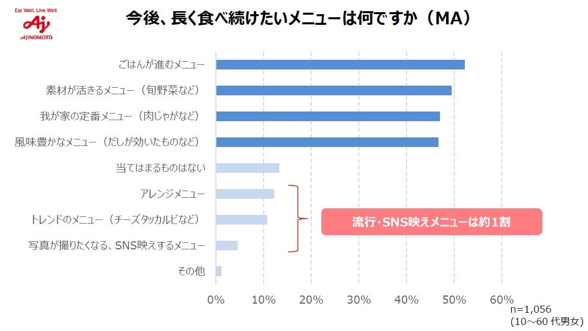 長く食べ続けたいメニューは、回答が多い順に「ごはんが進むメニュー」「素材が活きるメニュー」「定番メニュー」「風味豊かなメニュー」となりました。一方、「アレンジメニュー」「トレンドのメニュー」という回答はいずれも約1割、「SNS映えメニュー」は1割以下と低位にとどまっています。