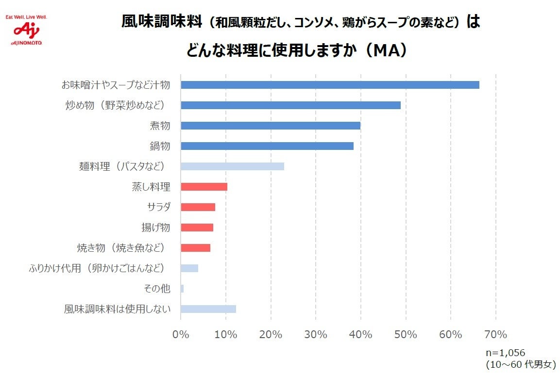 4.風味調味料の用途ランキングでは「汁物」「炒め物」「煮物」などの定番料理が上位に