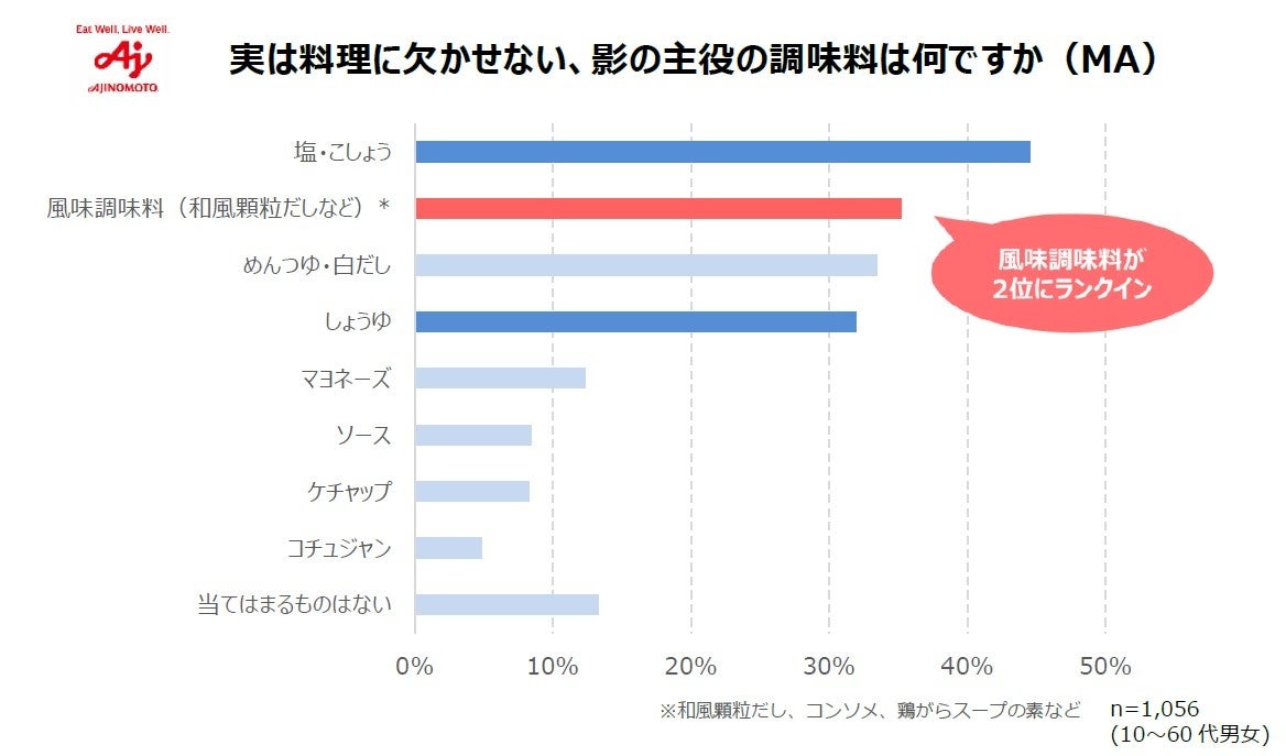 料理に欠かせない影の主役調味料ランキングでは「風味調味料」が「塩・こしょう」に次いで2位に