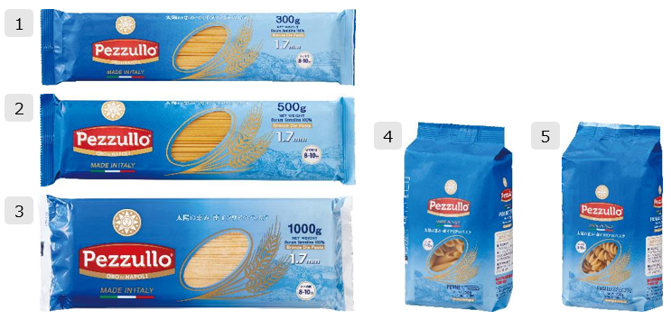 商 品 名:ペズロ スパゲッティ(①300g・②500g・③1kg)、④ペンネ、⑤フジリ