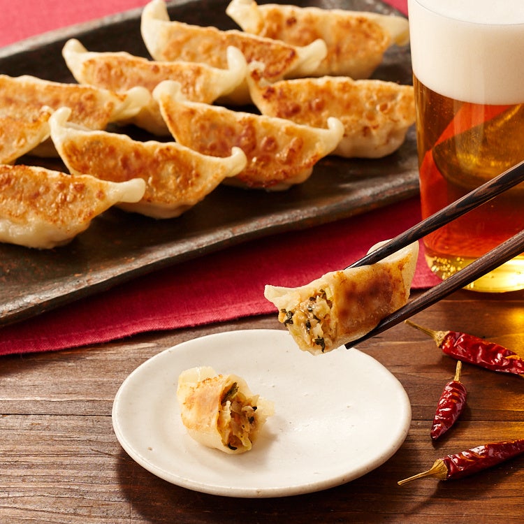 商品説明:人気のP肉餃子にしそ麻辣味が新登場。花椒の効いた、後を引く旨みのある辛さの麻辣味と、粗く刻んだ香り豊かなしそがよく合います。ごま油で表面をこんがり焼くとよりおいしくお召し上がりいただけます。お酒にもよく合う一品です。