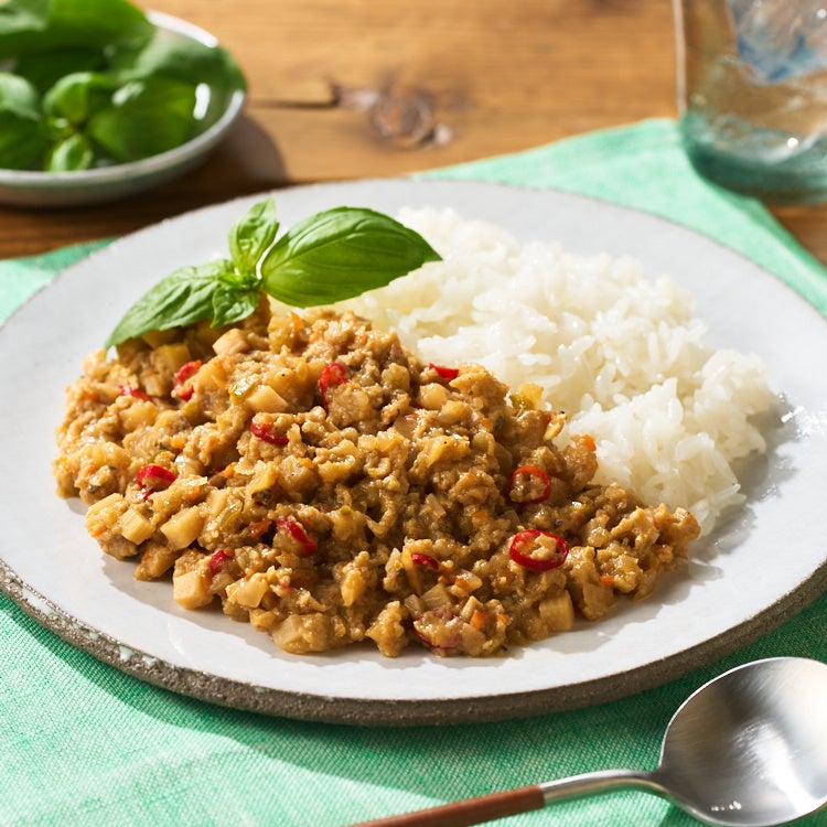 商品説明:ザクザクたっぷり具材が嬉しい!P肉ガパオライスの具。P肉そぼろに、たけのこ、にんじんなど5種の野菜を合わせ、食べ応えある具だくさんガパオに仕上げました。香味野菜を効かせた、清涼感のある香りに食欲もそそられます。バジルやパクチーなど、お好みのハーブを追加して楽しむのもおすすめです。