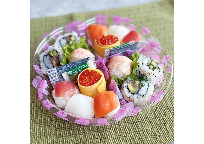カラフルで見た目に鮮やかなかわいいお寿司。手まり寿司や巻き寿司の詰め合わせです。