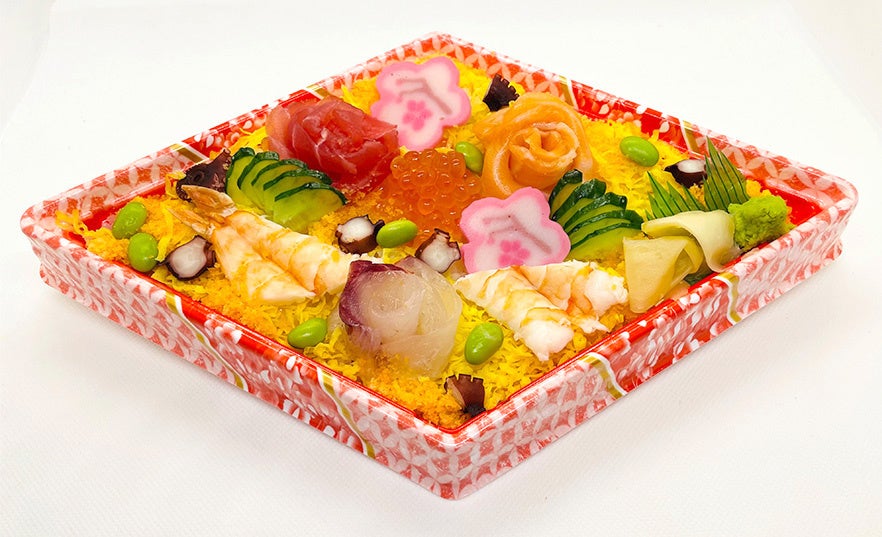 ひな祭りの縁起物、ちらし寿司。彩りよくいくら、サーモン、甘エビ、マグロがたっぷり、おいしさ満点。