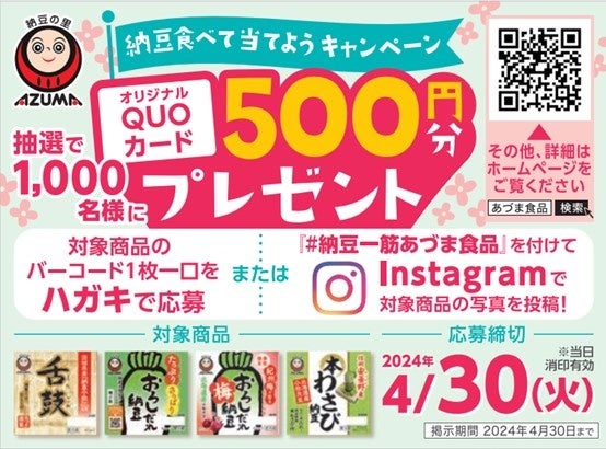 納豆専業メーカー あづま食品が、該当商品を購入し応募いただいた方から抽選で、オリジナルクオカードが当たる ”納豆食べて当てよう” キャンペーンを実施。皆様のご応募、お待ちしております。
