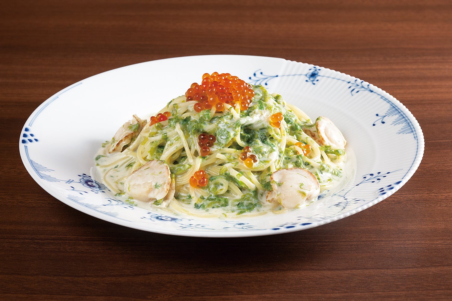 生海苔の風味豊かなクリームソースに、帆立といくらを贅沢にトッピング。