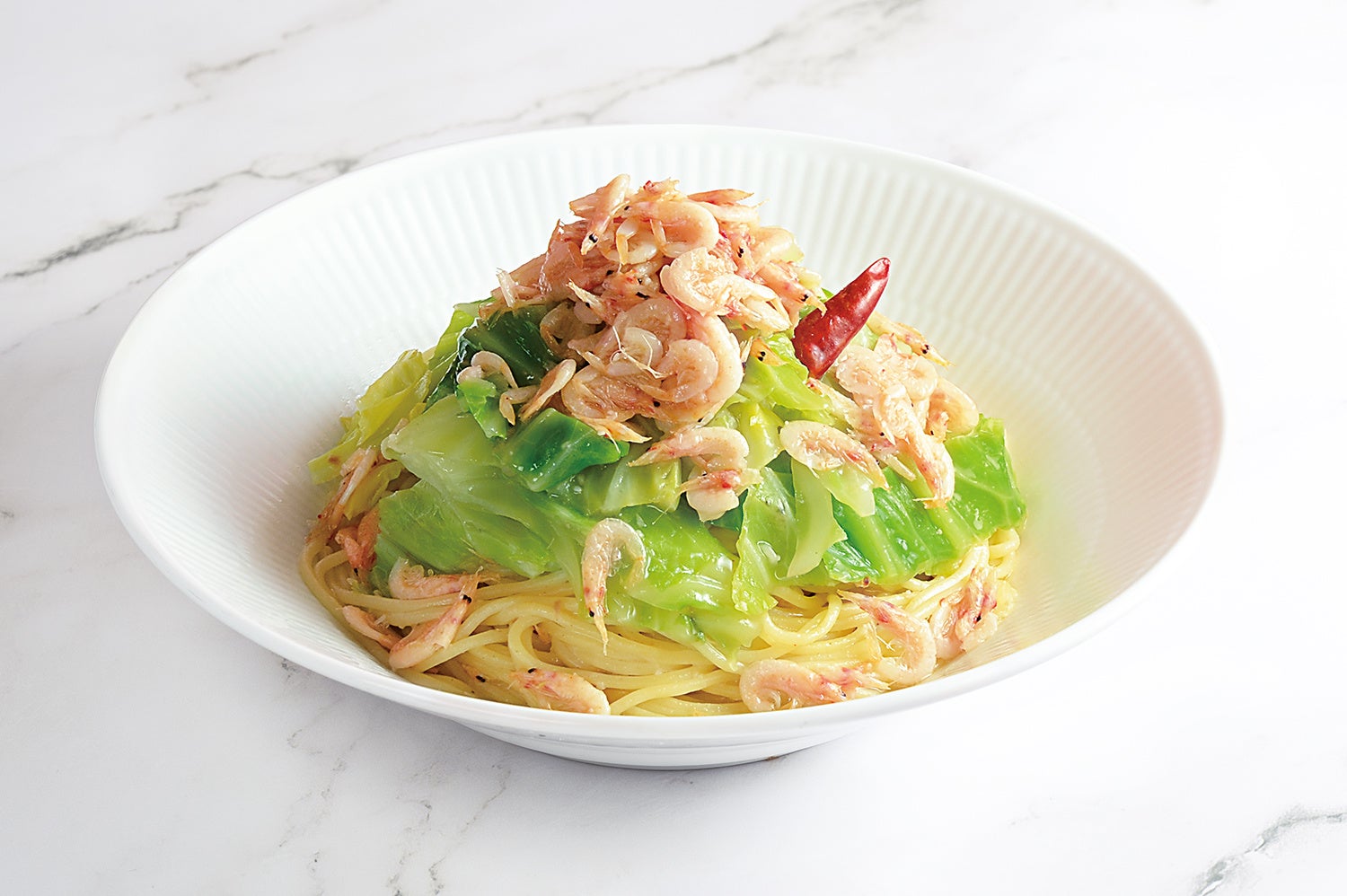 柔らかく甘い春キャベツと釜揚げ桜えびをアンチョビソースで仕上げました。