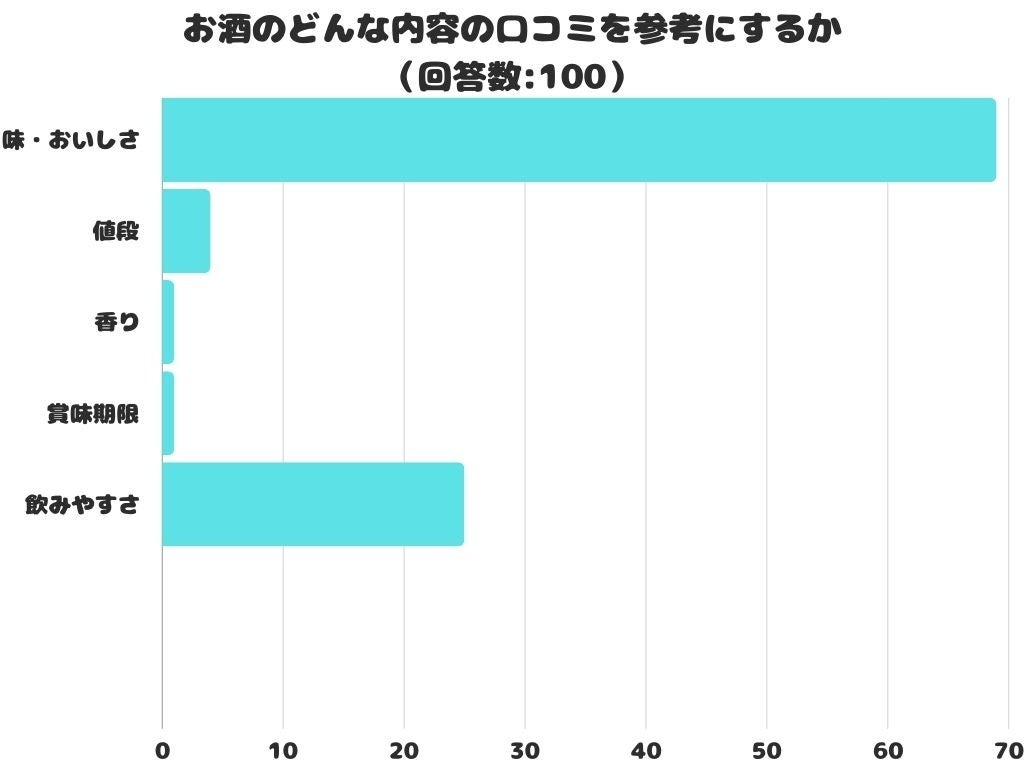 お酒のどんな内容の口コミを参考にするをアンケートにて調査したところ、1位は「味・おいしさ」でした。