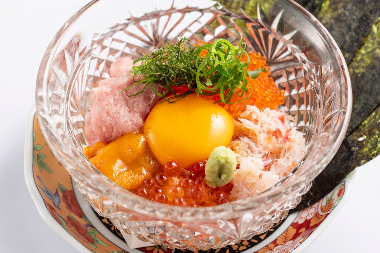 鰻や雲丹、トロ、和牛などの豪華食材をふんだんに使用し、贅沢を極めたにのやオリジナルの寿司。中でもおすすめは名物「にのや巻き」。生雲丹やいくら、蟹身などを贅沢に乗せた寿司飯をおしゃれな小鉢に入れ、ご自身で卵黄醤油漬けと混ぜ、手巻きにして召し上がっていただく一品です。その場で出来たての手巻き寿司を味わうことができ、ご自身で仕上げていただく楽しさも感じていただけます。