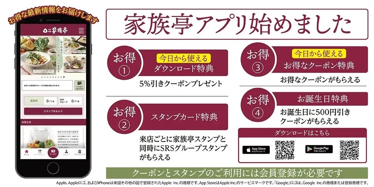 「家族亭」では、お得な情報発信やクーポン機能などを持つ「家族亭公式アプリ」をはじめ、スマホからテイクアウトを事前に注文・会計を済ませられるWEB予約が便利です。Xキャンペーンでもらえる「家族亭デジタルお食事券」など、ブランド体験のデジタル化(DX)を進めております。デジタル技術の活用により、お客様がさらに、便利にご利用いただけるよう取り組んでまいります。