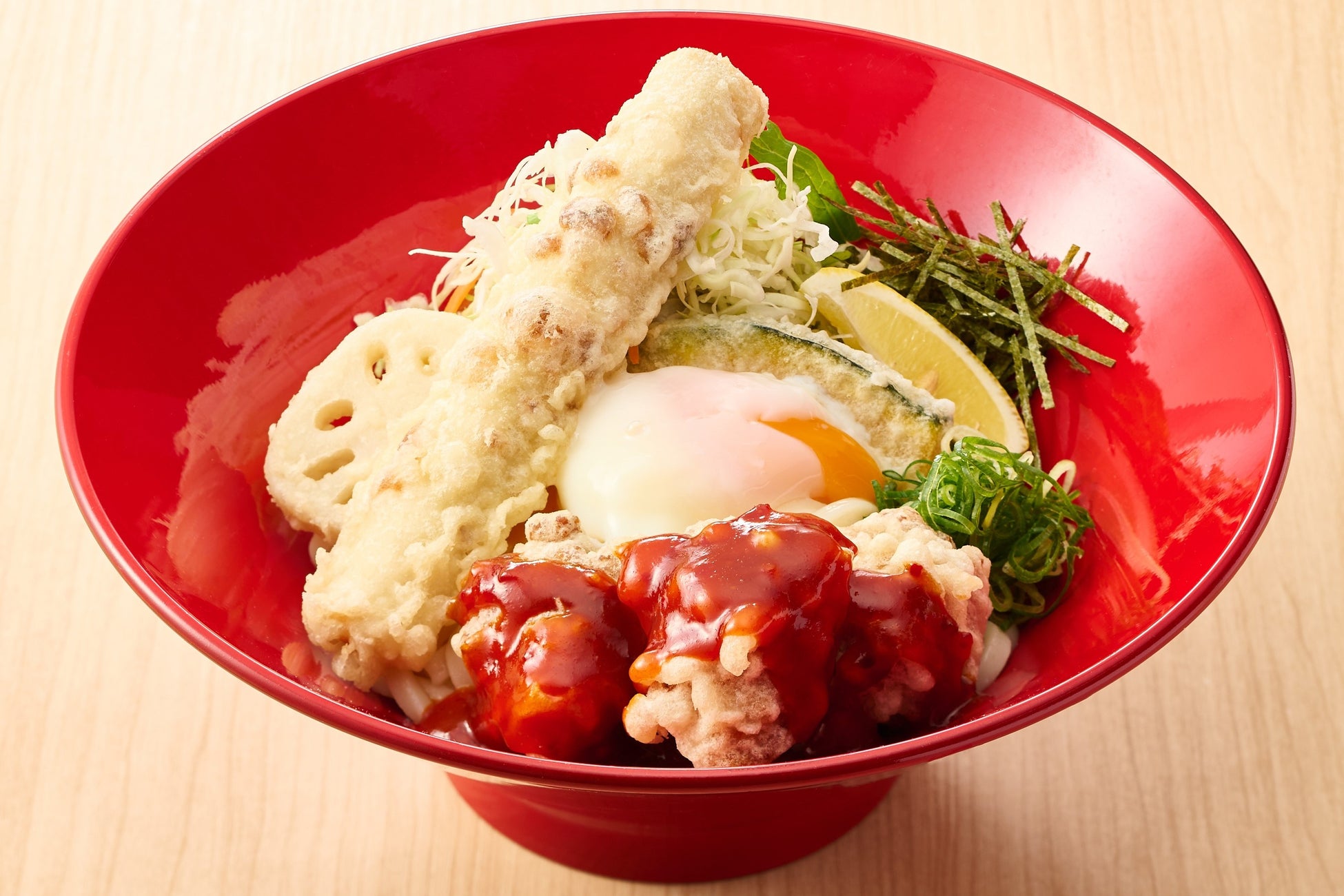 定番の「得得ぶっかけうどん」は辛みが食欲を掻き立てるヤンニョムチキン、ボリュームのあるちくわ天・れんこん天・かぼちゃ天・温玉がトッピング!こちらの商品もうどん3玉同一価格でお腹の空き具合にあわせて1玉・1.5玉・2玉・3玉とボリュームが選べます。