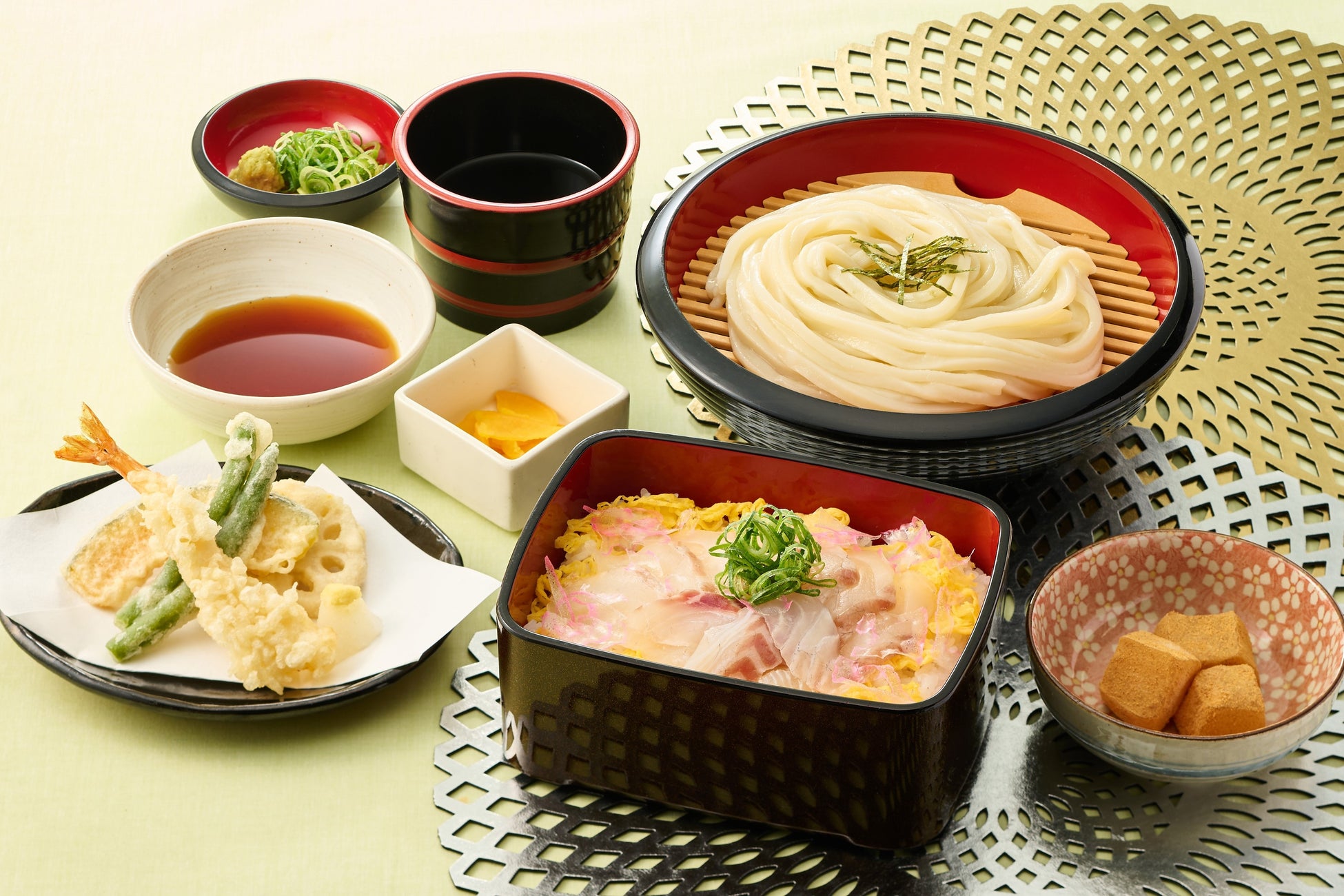 高知県産の真鯛を使用したお重と揚げたての天ぷら4種、選べるうどんの御膳は甘味にわらび餅もついてお得!