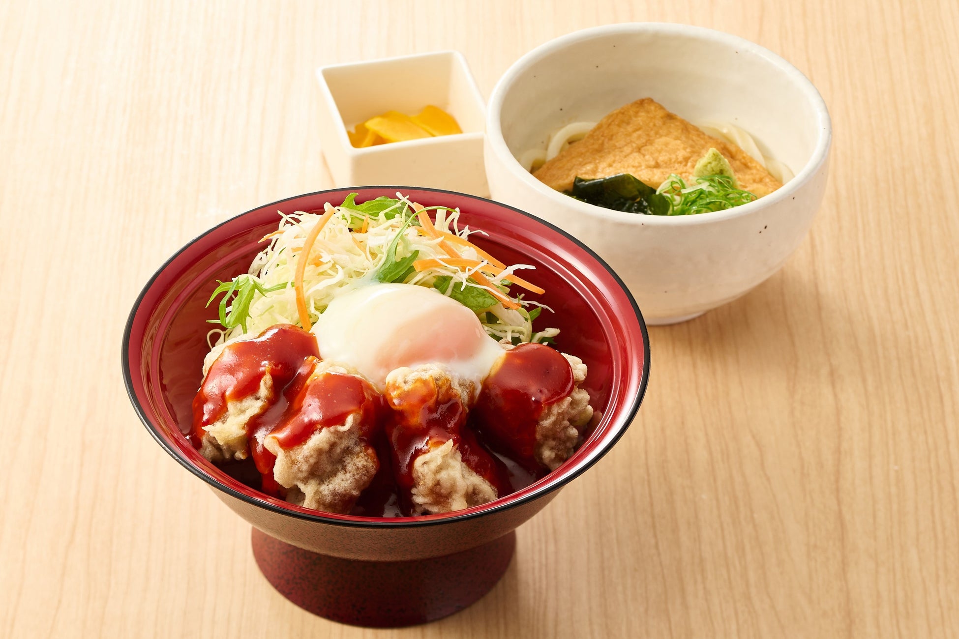 甘辛ヤンニョムソースが食欲を掻き立てる「ヤンニョムチキン丼」はトッピングの温玉と合わせることで辛さもマイルドに選べるうどんは冷うどんがおすすめ。