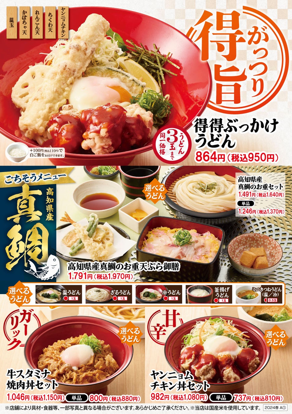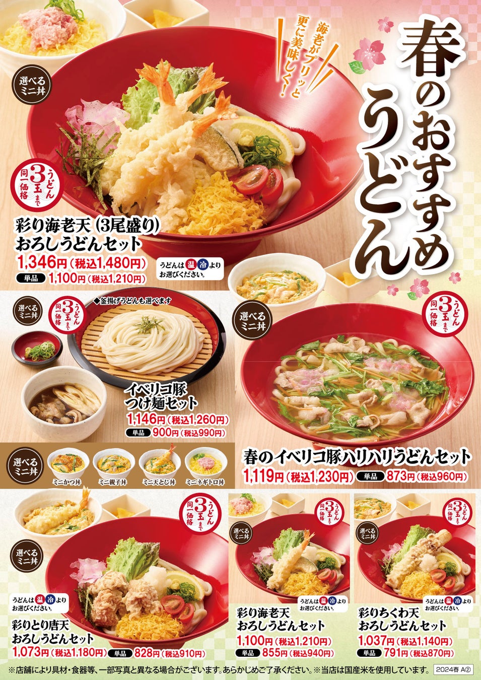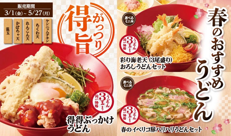 得得 春のおすすめうどんは、甘い肉と脂身が特徴のある最上級ベジョータのイベリコ豚を使用した「春のイベリコ豚のハリハリうどんセット」や、「イベリコ豚つけ麺セット」がおすすめです。セットで選べるミニ丼は、「ミニカツ丼」「ミニ親子丼」「ミニ天とじ丼」「ミニネギトロ丼」から選べます。もちろんうどんは3玉まで同一価格です。また、鮮やかな色合が食欲をそそる「彩り海老天(3尾盛り)おろしうどんセット」「彩りとり唐天おろしうどんセット」「彩り海老天おろしうどんセット」「彩りちくわ天おろしうどんセット」も人気です。