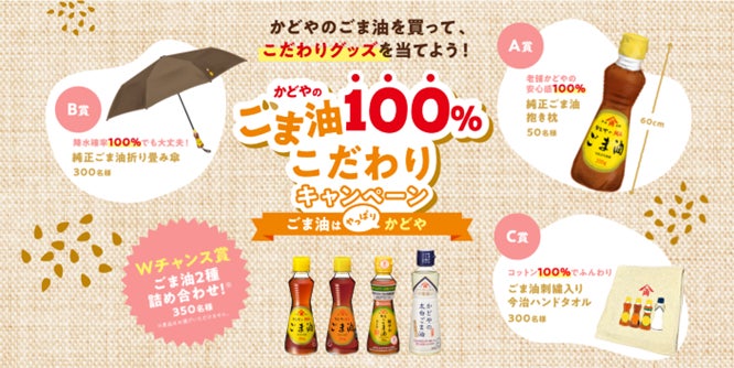 ご応募いただいた方の中から抽選で、純正ごま油抱き枕、純正ごま油折り畳み傘、ごま油刺繍入り今治ハンドタオルといった、”100%”にこだわったかどやのオリジナルグッズをプレゼント。