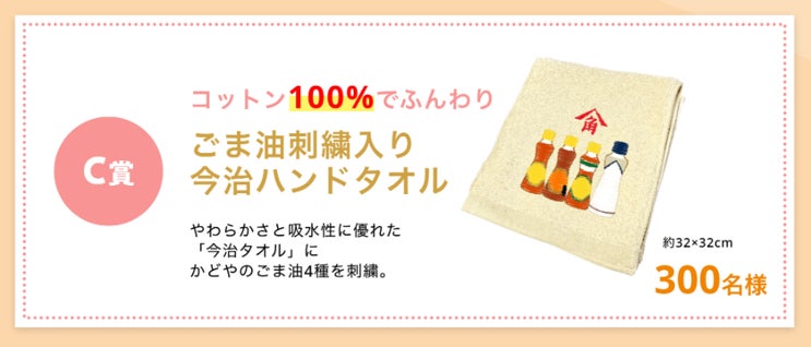 C賞:コットン「100%」でふんわり ごま油刺繡入り今治ハンドタオル<300名様>