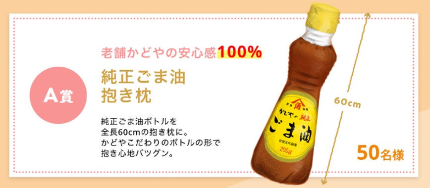 A賞:老舗かどやの安心感「100%」 純正ごま油抱き枕 <50名様>