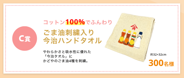 C賞:コットン「100%」でふんわり ごま油刺繡入り今治ハンドタオル<300名様>
