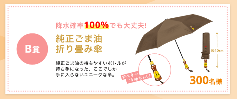 B賞:降水確率「100%」の雨の日でも大丈夫! 純正ごま油折り畳み傘 <300名様>